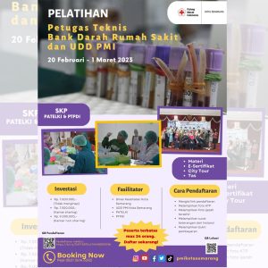 PMI Kota Semarang kembali menyelenggarakan Pelatihan Petugas Teknis Bank Darah Rumah Sakit dan UDD PMI. Pelatihan ini akan diselenggarakan mulai tanggal 20 Februari 2023 sampai…